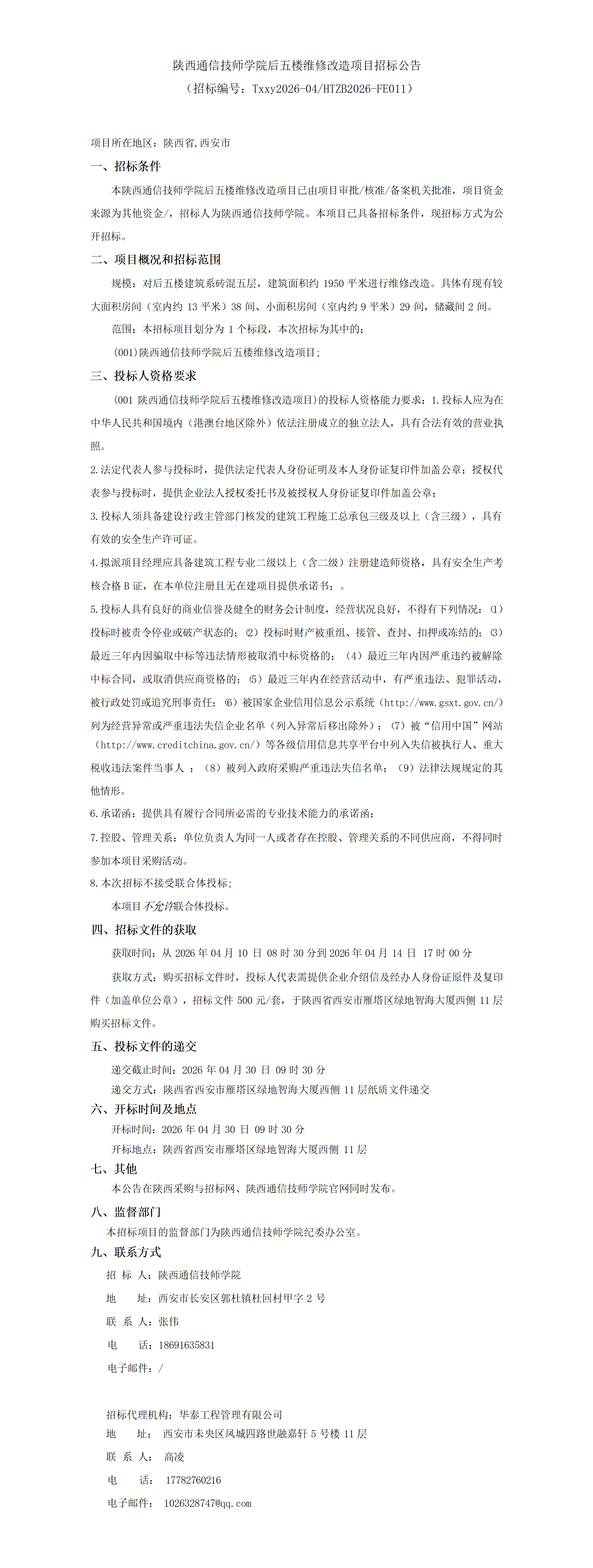 首页 > 新闻中心 > 校园公告 > 陕西通信技师学院后五楼维修改造项目招标公告
